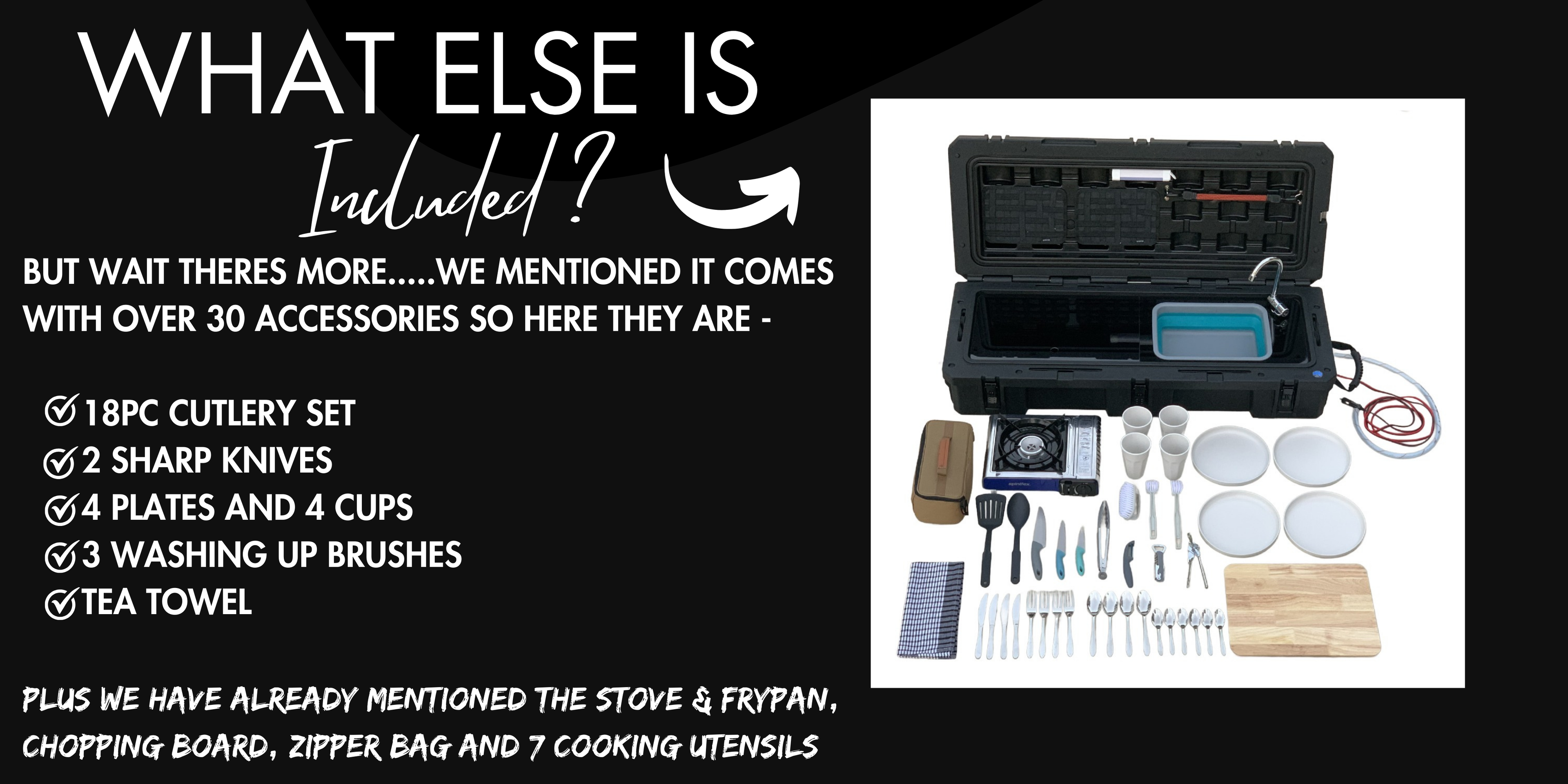 Recently purchased the portable kitchen. I took it out on its first day trip to the desert and it worked flawlessly. I’ve been looking for a portable kitchen solution that was compact and had everything I could need for camping trips and tailgating during football season. This fit the bill. Great communication, easy ordering and fast shipping. The guys even help coordinate conversion to US dollars and shipping rate to me. I appreciate the great service and great quality product. My only suggestion would be to include a knife sheath for the supplied kitchen knife.
