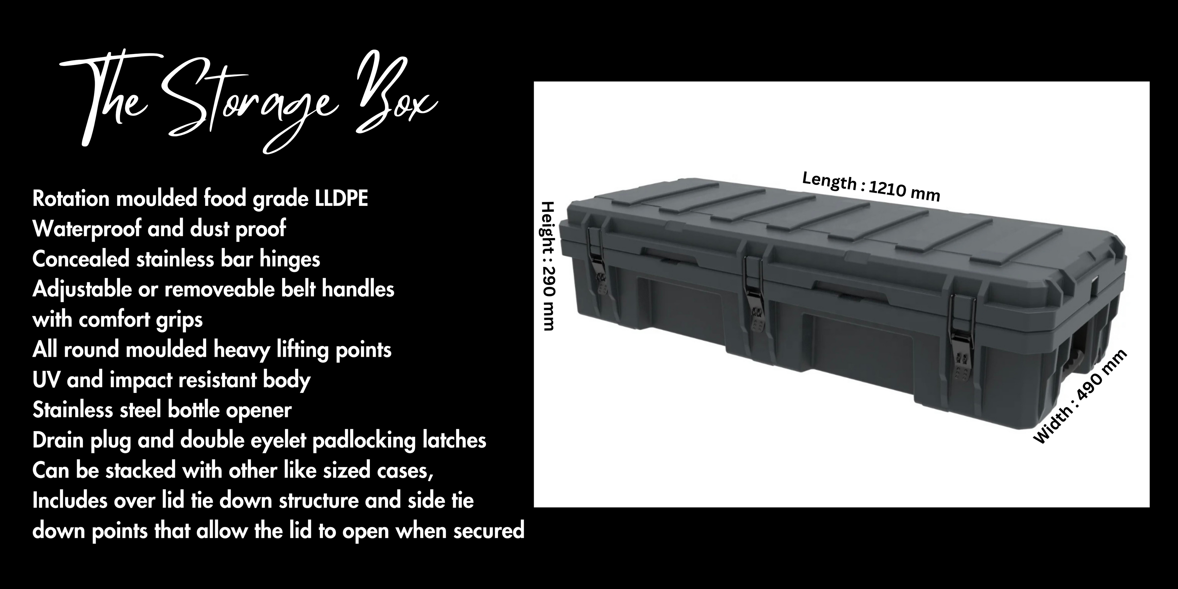 The Storage Box is Weatherproof and Dustproof with concealed Stainless bar hinges. It is moulded food grade LLDPE with a UV and Impact resistant body
