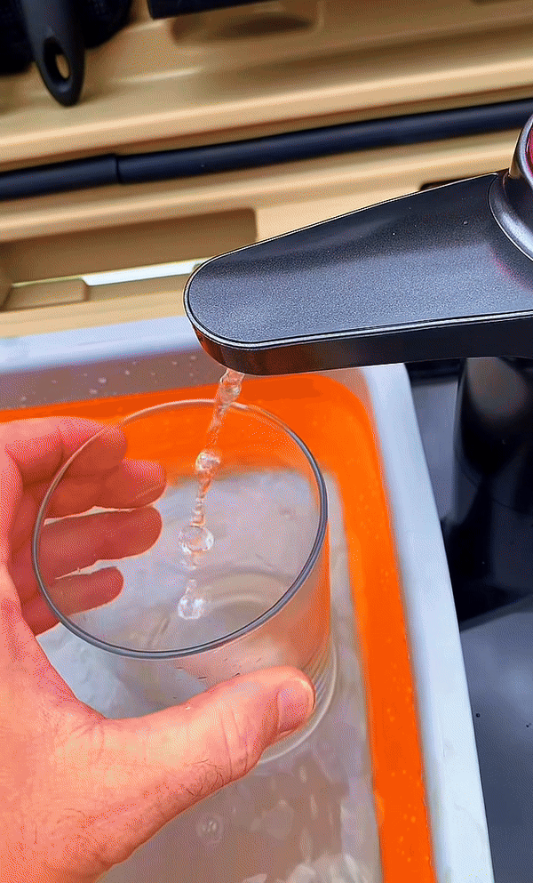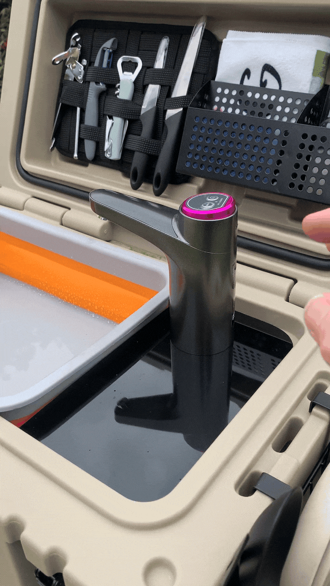 Our Mini Camping Portable Kitchen provides a convenient electric tap and sink, making washing up easy and hygienic while camping or on a picnic