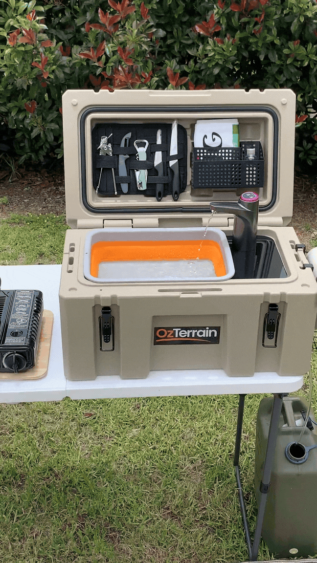 Simplify camp life with a built-in sink and tap system that makes washing up quick and easy. Whether you're rinsing dishes or filling bottles, the OzTerrain Portable Kitchen gives you reliable access to clean water β right where you need it